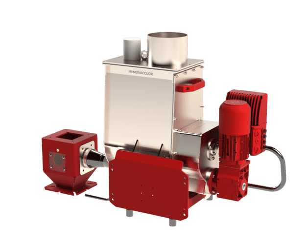 Movacolor has, based on its proven gravimetric technology, developed a heavy duty powder dosing unit capable to dose maximum 450 kg/h of non-free flowing powder. The design is based on a single spiral and agitator, driven by a heavy duty 3 phasemotor. The hopper can be increased in a modular way from 25 to 50 liters.